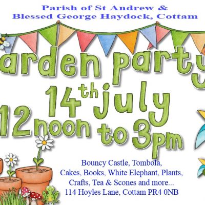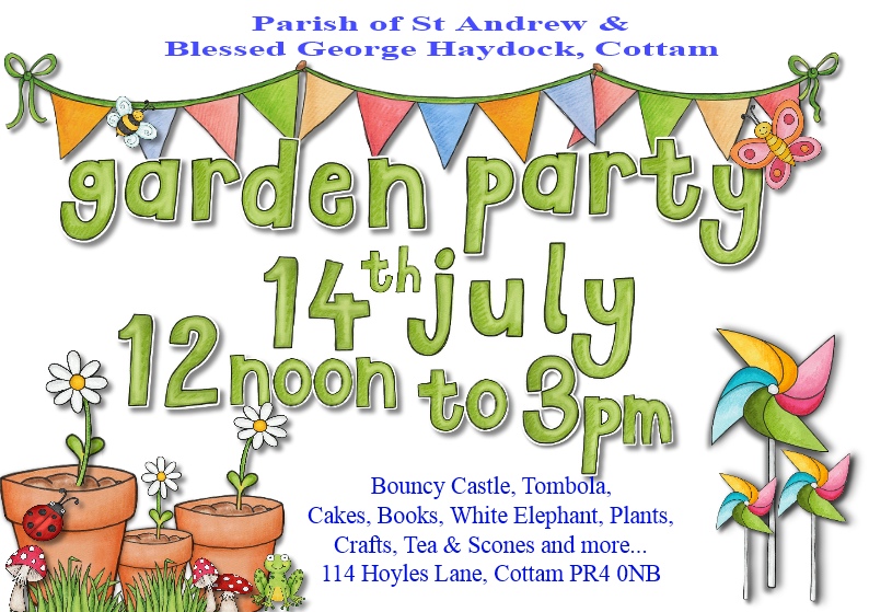 Annual Garden Party 14th July 2019 11:30 am St Andrew's Cottam 114 Hoyles Lane Cottam Preston Lancashire PR4 0NB Get Directions The annual Garden Party will take place this year on the 14th July.