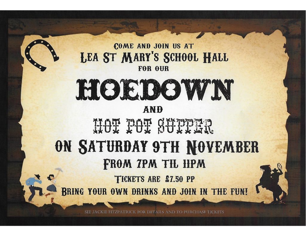 Hoe Down & Hot Pot Supper 9th November 2019 7:00 pm – 11:00 pm St Mary's Catholic School Church Hall PR4 0RJ Get Directions A social event in St Mary’s School Hall. Bring your own drink and glasses. Tickets £7.50.