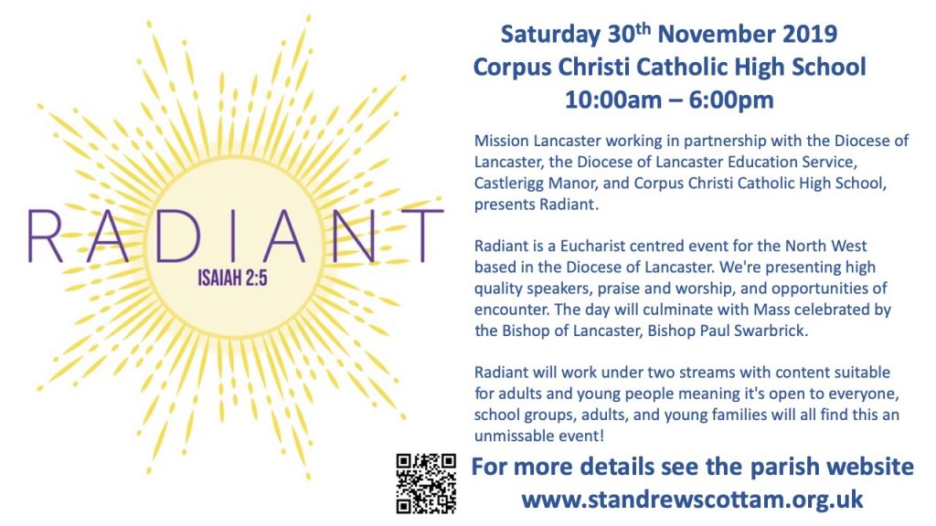 Radiant – Eucharist Event 30th November 2019 10:00 am – 6:00 pm Corpus Christi Catholic High School St Vincent Road Preston Get Directions Register Click the Register button to book your tickets now.